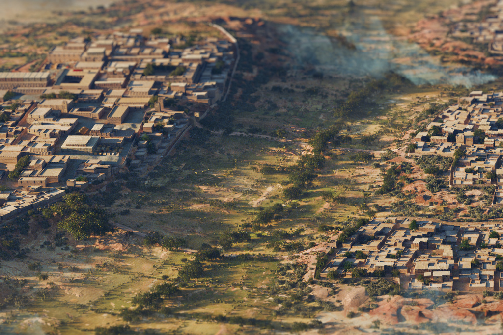 In order to create an artist's impression of the entire city, a technical foundation was laid using GIS to georeference modern sources and historic maps. Drone footage provided a photogrammetry base for excavated areas.