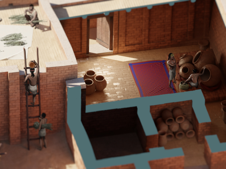 Two cutaways were created: one of the Great Bath (a large building with a bitumen-lined bath) and one of a residential area in the lower town. Both were designed to highlight known archaeological features.