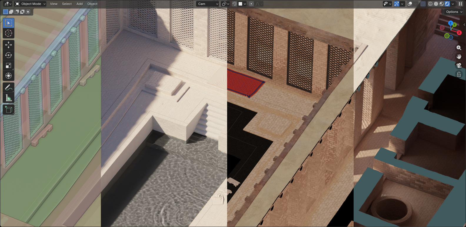 Extensive use was made of procedural tools, using Blender’s geometry nodes. These tools worked in tandem with carefully hand-placed elements based on archaeological excavations.