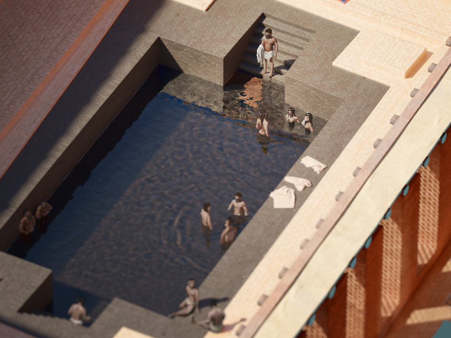 Two cutaways were created: one of the Great Bath (a large building with a bitumen-lined bath) and one of a residential area in the lower town. Both were designed to highlight known archaeological features.