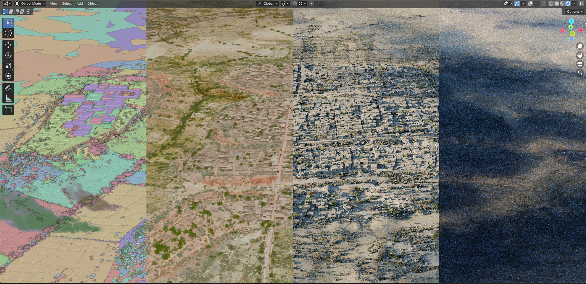 Extensive use was made of procedural tools, using Blender’s geometry nodes. These tools worked in tandem with carefully hand-placed elements based on archaeological excavations.